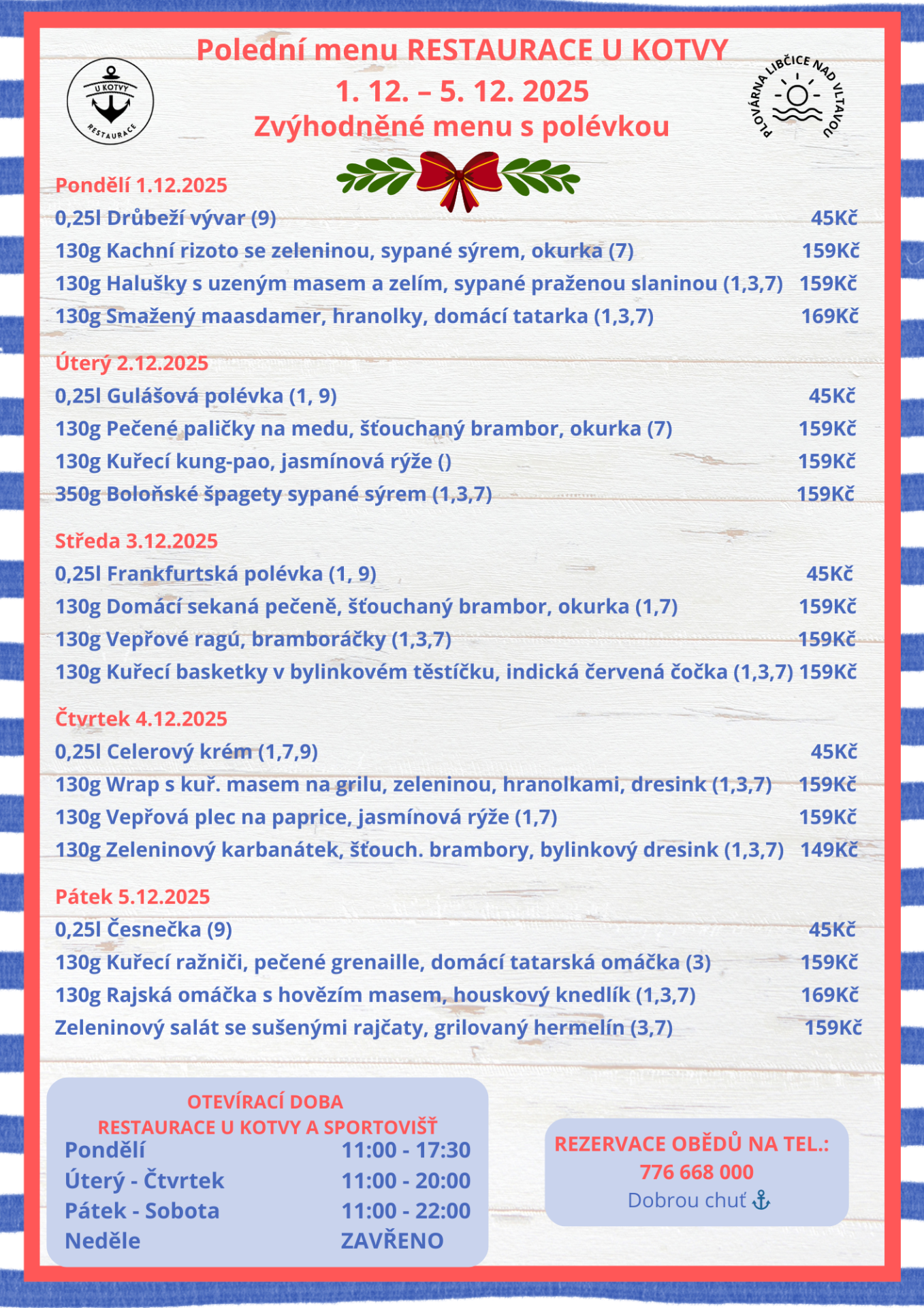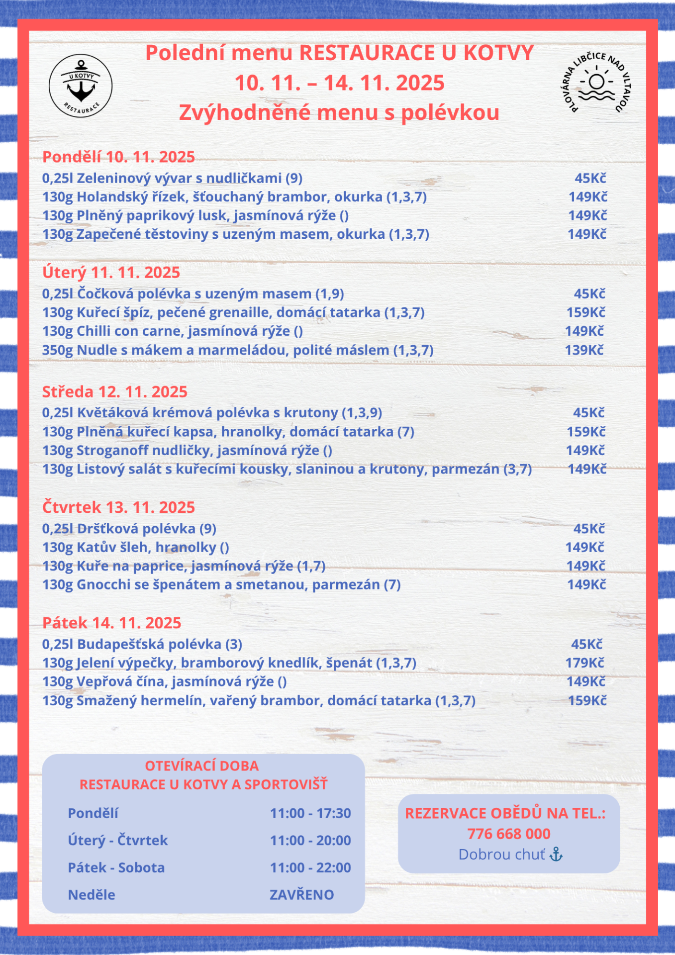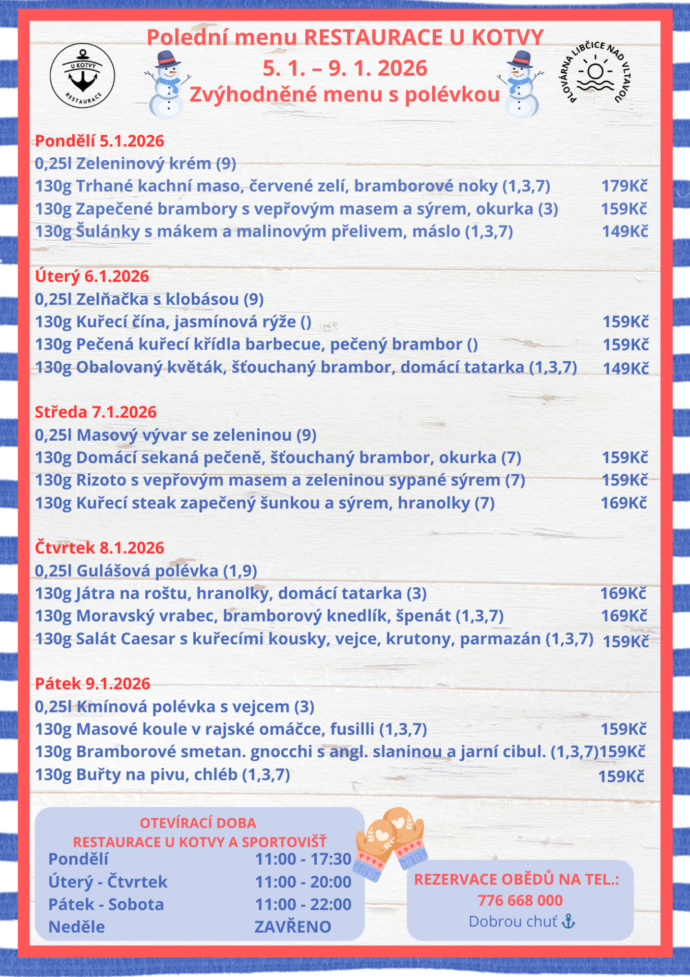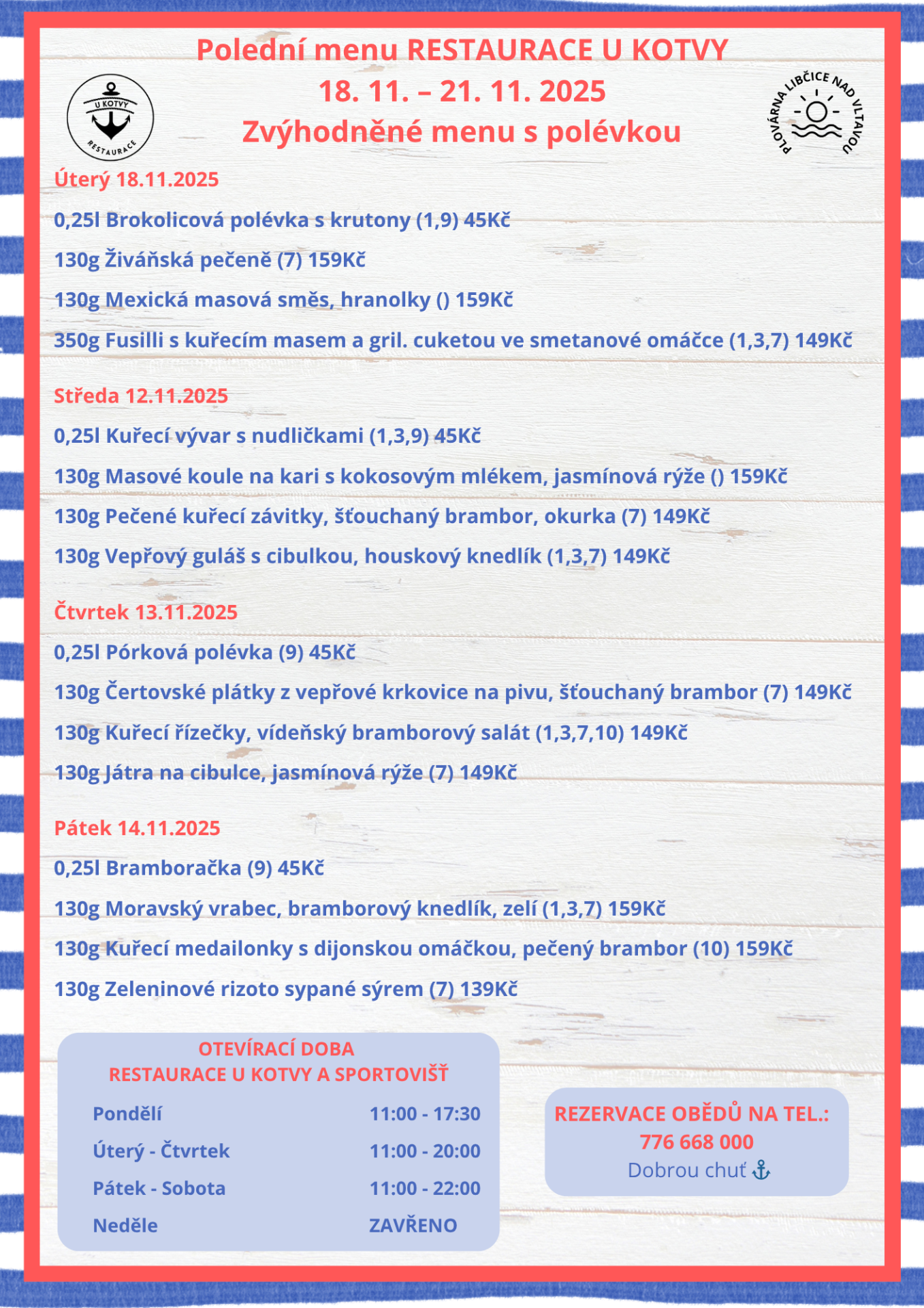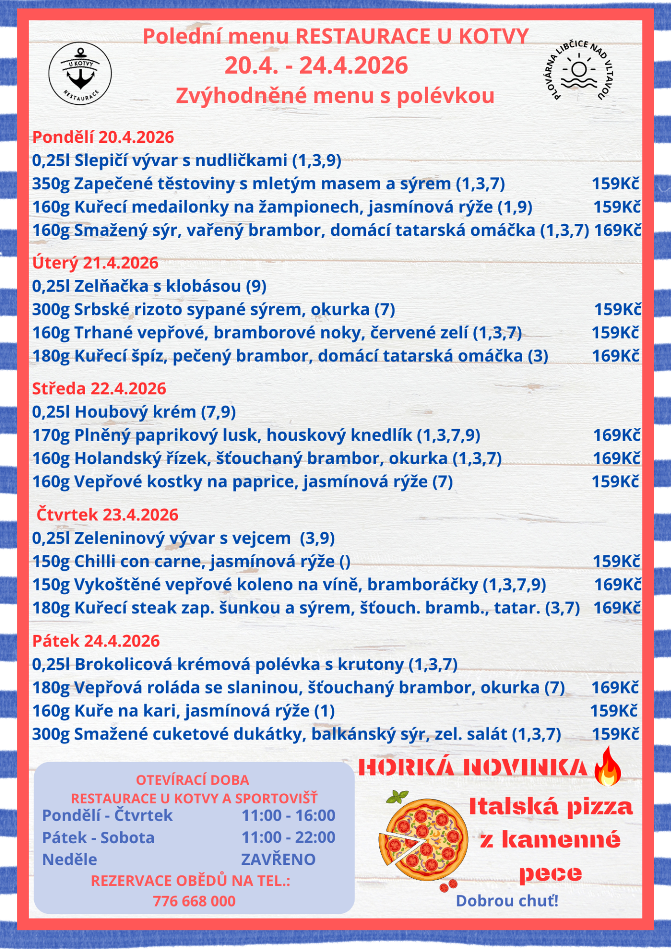 V restauraci U Kotvy najdete bohaté občerstvení, polední menu, nápoje a zmrzliny.